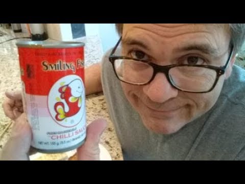 Fried Mackeral with Chilli (yes it's misspelled) - Smiling FIsh Brand - Smiling Fish Canned Food - Dangerous can top removal. Do not try this method at home. Call a professional.